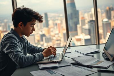 A serene scene of a young international student standing amidst lush greenery, their luggage by their side, gazing up at a vibrant, sun-dappled sky. In the foreground, a stack of documents and a pen symbolize the importance of comprehensive travel insurance, while in the background, a modern city skyline suggests the global nature of their journey. Warm, golden lighting bathes the entire composition, creating a sense of comfort and security. The image conveys the peace of mind that comes with choosing the right student travel insurance policy to protect one's overseas studies and adventures.